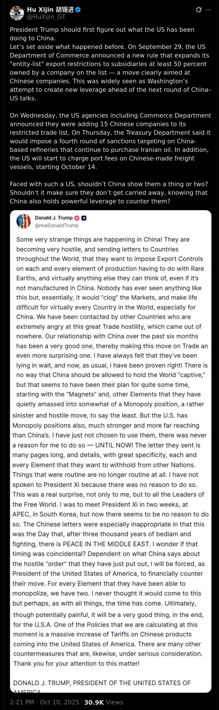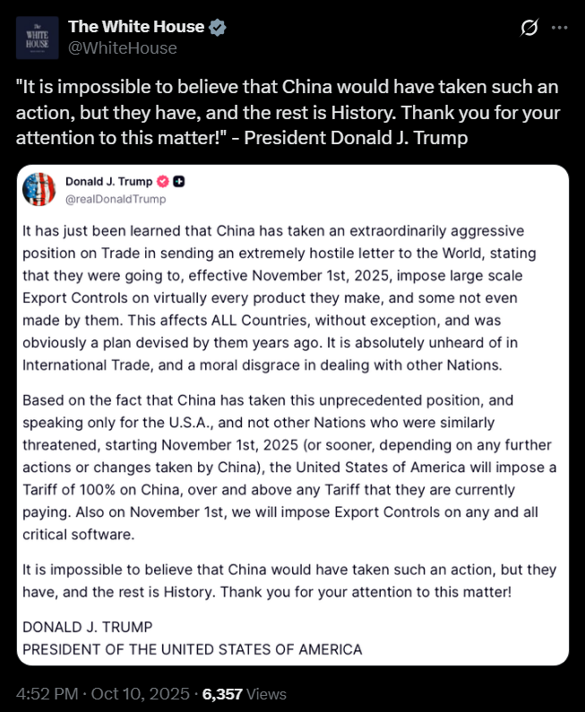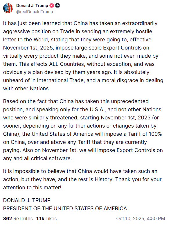 [059]@realDonaldTrump China has taken an extraordinarily aggressive position on Trade...they will effective November 1st, 2025, impose large scale Export Controls on virtually every product they make... Nov 1st or sooner the United States of America will impose a Tariff of 100% on China...
