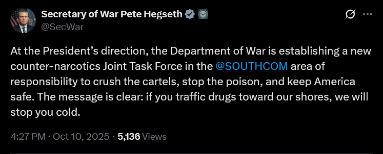 [056]@SecWar At the President’s direction the DoW is establishing a new counter-narcotics Joint Task Force to crush the cartels, stop the poison, and keep America safe