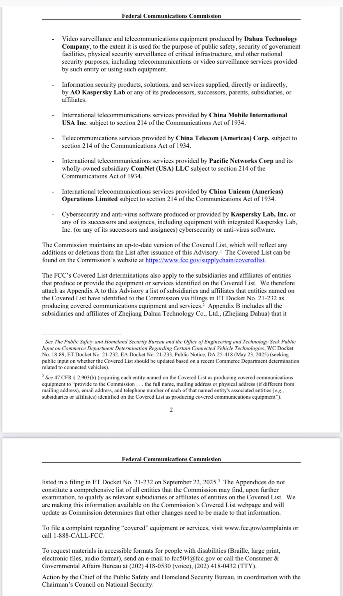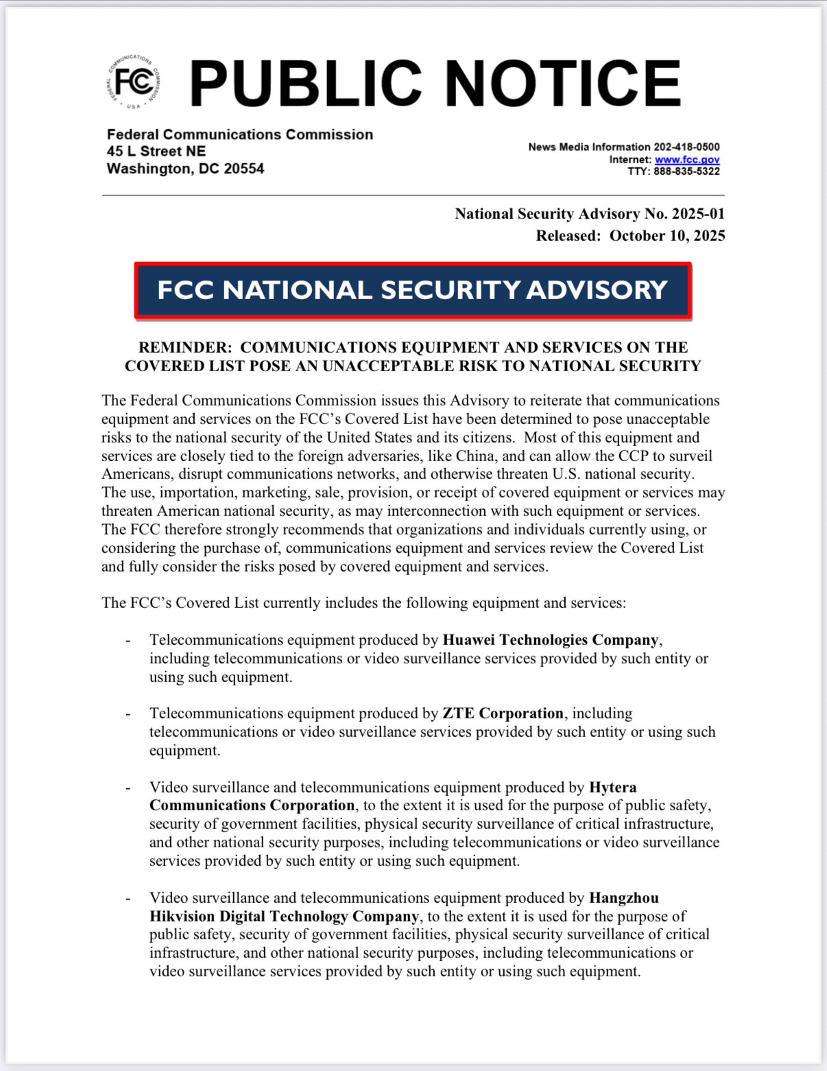 [062]The FCC issues a National Security Advisory to highlight the equipment & services on our Covered List that pose unacceptable risks to the U.S. and its citizens. [China]