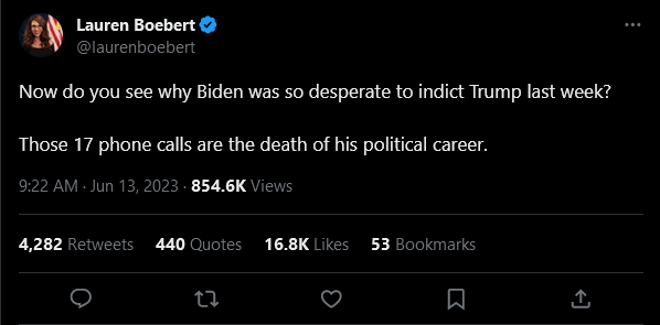 [143]Lauren Boebert: Now do you see why Biden was so desperate to indict Trump last week? Those 17 phone calls are the death of his political career media link