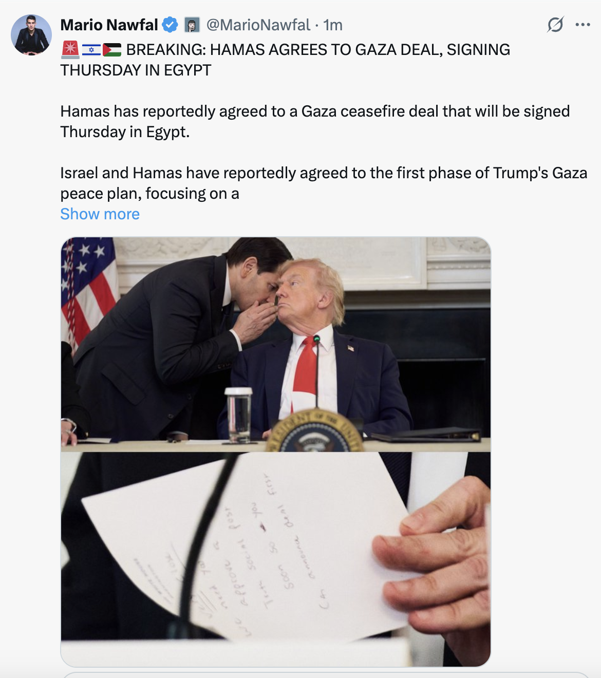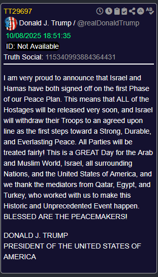 [068]@realDonaldTrump I am very proud to announce that Israel and Hamas have both signed off on the first Phase of our Peace Plan media link