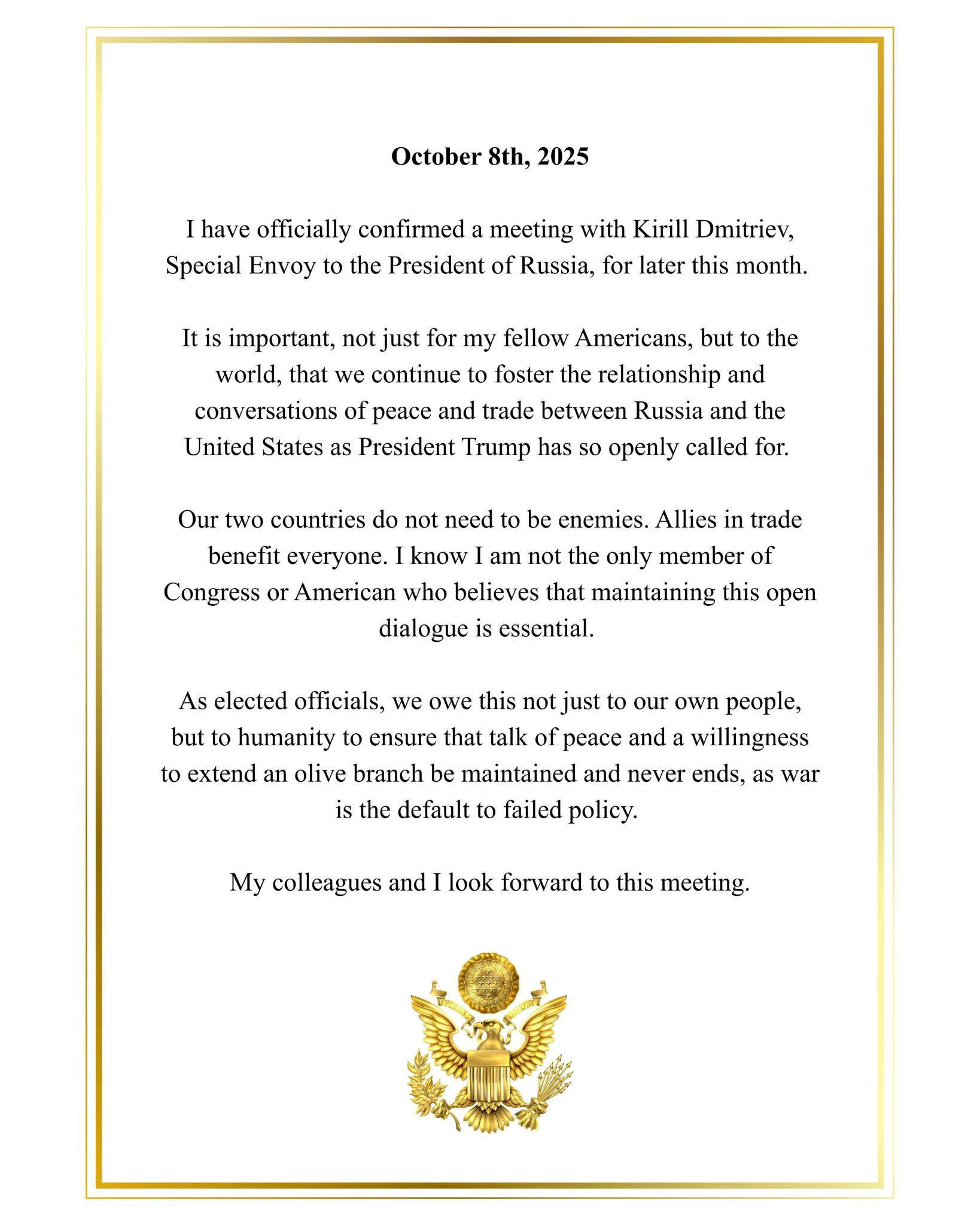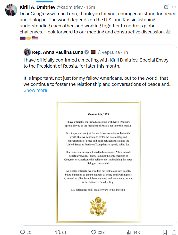 [056]@kadmitriev Dear Congresswoman Luna, thank you for your courageous stand for peace and dialogue media link media link