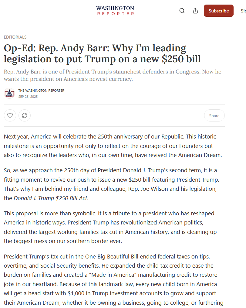 [009]@realDonaldTrump Op-Ed: Rep. Andy Barr: Why I’m leading legislation to put Trump on a new $250 bill media link media link