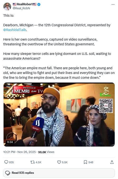 [079]ICYMI: Dearborn, Michigan — the 12th Congressional District, represented by @RashidaTlaib, “The American empire must fall. There are people here, both young and old, who are willing to fight and put their lives and everything they can on the line to bring the empire down, because it must come down.”